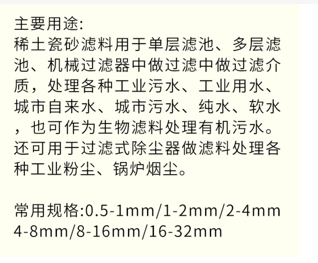 稀土瓷砂濾料廣泛用于濾池,有效的處理各種進水和污水,還可以用于煙氣除塵器中做濾料,過濾除去各種工業(yè)粉塵和鍋爐煙塵。